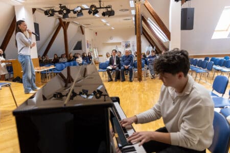Gospod Bielen nas je obiskal v okviru tako imenovanih frankofonskih pavz, v okviru katerih je skupina frankofonskih veleposlanikov v Sloveniji obiskala pet ljubljanskih srednjih šol, eno v Novi Gorici, v Celju pa našo gimnazijo.