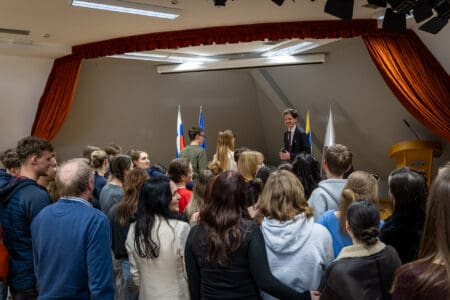 Na mednarodni dan Frankofonije, 20. marca, nas je obiskal gospod Laurens Bielen, sekretar na Veleposlaništvu Kraljevine Belgije na Dunaju. Z eminentnim gostom smo se pogovarjali o vlogi francoščine v sodobnem svetu, o frankofoniji, Belgiji, možnostih štipendiranja ter kariernih priložnostih v diplomaciji.